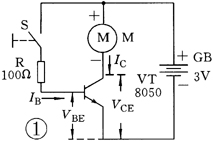 三极管电子开关电路 见图1 。由开关三极管VT,玩具电动机M,控制开关S,基极限流电阻器R和电源GB组成。VT采用NPN型小功率硅管8050,其集电极最大允许电流ICM可达1.5A,以满足电动机起动电流的要求。M选用工作电压为3V的小型直流电动机,对应电源GB亦为3V 。   VT基极限流电阻器R如何确定呢?根据三极管的电流分配作用,在基极输入一个较弱的电流IB,就可以控制集电极电流IC有较强的变化。假设VT电流放大系数hfe≈250,电动机起动时的集电极电流IC=1.5A,经过计算,为使三极管饱和导通所需的基极电流IB≥(1500mA/250)×2=12mA。在图1电路中,电动机空载时运转电流约为500mA,此时电源(用两节5号电池供电)电压降至2.4V,VT基极-发射极之间电压VBE≈0.9V。根据欧姆定律,VT基极限流电阻器的电阻值R=(2.4-0.9)V/12mA≈0.13kΩ。考虑到VT在IC较大时,hfe要减小,电阻值R还要小一些,实取100Ω。为使电动机更可靠地启动,R甚至可减少到51Ω。在调试电路时,接通控制开关S,电动机应能自行启动,测量VT集电极—发射极之间电压VCE≤0.35V,说明三极管已饱和导通,三极管开关电路工作正常,否则会使VT过热而损坏。   自动灭火的热量自动控制电路 见图2。该电路是将图1中的控制开关S换成双金属复片开关ST,就成为热控电路了。当蜡烛火焰烧烤到双金属复片时,复片趋于伸直状态,使得开关ST接通,电动机启动,带动小风扇叶片旋转,对准蜡烛吹风,自动将火焰熄灭;当双金属片冷却后,开关断开,小电风扇自动停转,完成了自动灭火的程序。   自动停车的磁力自动控制电路 见图3。开启电源开关S,玩具车启动,行驶到接进磁铁时,安装在VT基极与发射极之间的干簧管SQ闭合,将基极偏置电流短路,VT截止,电动机停止转动,保护了电动机及避免大电流放电。