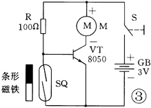 在磁力自动控制电路中,传感元件是干簧管,当磁铁靠近时,常开触点闭合而接通传感电路,完成位置传感作用。   能不能用干簧管开关直接控制电动机的转与停呢?玩具电动机是常用的动力装置,它能够把电能转换为机械能,可用于小电风扇转动、小离心水泵抽水等执行功能。通常玩具直流电动机工作电压低,虽然在1.5~3V就可以启动,但起动电流较大(1~2安培),如果用触点负荷仅为几十毫安的干簧管进行开关控制,将大大缩短其使用寿命。因此,在自动控制电路中,常使用电子开关来控制电动机的工作状态。