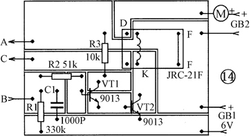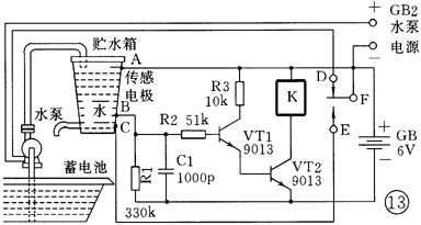 通常利用水塔向用户自来水龙头供水,而水塔则需要利用水泵向贮水箱不断补充水,水多了会溢出,少了供水又会中断,这就需要水位自动控制装置。   小水塔水位自动控制电路 见图13。它由水位传感电极、控制电路、电动机(小离心水泵用)和电源等组成。控制电路由VT1、VT2和继电器K等组成。当水箱缺水时,水面低于B点,水位传感电极A—B、B—C之间由于没有被水淹没而开路,VT1、VT2截止,继电器呈释放状态,继电器衔铁F与常闭触点D接触,接通水泵电源GB2,小离心水泵电动机启动,向贮水箱供水。当水位上升至A点,水位传感电极A—B之间被水淹没,产生偏置电流使得VT1、VT2导通,继电器吸合,常闭触点断开,小离心水泵停止供水。此时,继电器衔铁F与常开触点E相触,电源通过继电器接通的常开触点F-E以及C—B之间能微弱导电的水,继续产生维持VT1、VT2导通所需的偏置电流,继电器吸合。自控电路直到水位降至B点以下时,C—B之间开路,VT1、VT2截止,继电器释放,常闭触点接通,小离心水泵开始供水。如此周而复始,完成水位自动控制作用。